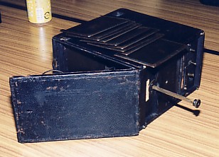 アダムス社(イギリス)で1892年ごろ作られた手札判乾板カメラのアイデアル。12枚の乾板を内蔵し撮影が終わったら写真に見られるつまみの付いた棒を引っ張り、続いて元に戻すと撮影された乾板が移動して所定の場所に収納されるという構造。レンズはF8のラピッドレクチリニア、シャッターは空気ポンプ式。(七井貞明さん所有) |