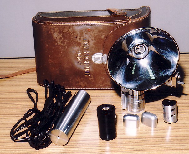 吉田安夫さんのキヤノンが1950年頃発売したフラッシュガンセット。真鍮に分厚いクロームメッキを施した高級感溢れるモデルです。 |