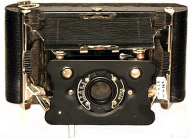 七井貞明さんのNo.1セネカ・ジュニア。所有者の七井さんによれば、コダックの「コダックガール」に対抗してアメリカ先住民族「セネカ族」の女性を使い宣伝したという。120フィルム使用で6×9cmのアパーチャーを持つフォールディングカメラ。 |