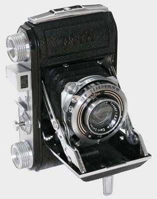 ヴィルギン(Wirgin)の35mmレンズシャッターカメラ、エディネックスVタイプ4の改良型。V型はエディネックスに連動距離計装備したもので、裏蓋は取り外し式。この写真のモデルは、裏側の一部にヒンジ付きの蓋をつけたタイプ4をさらに改良したもので、底蓋は半分を固定しパトロネの出し入れを行う部分のみヒンジを付けた蓋になっている。 |