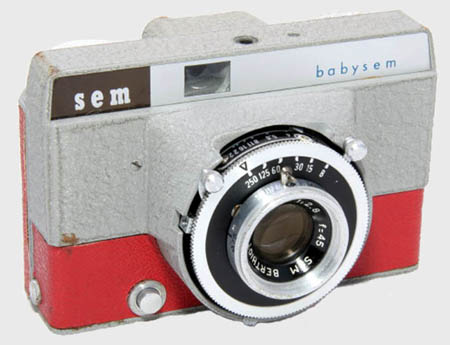 ファインダーが向かって左にあり、巻き上げは左手でレバーをスライドして行う。1957年ヴェルタ カメラ-ヴェルケで製造。 |