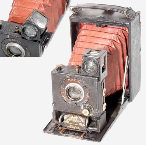 イギリス製と思われるマガジンカメラ。メーカーやカメラ名は不明。カメラ後部に乾板ないしシートフィルムを6~12枚(乾板)または20~40枚(シート)収納しておき、撮影するごとにレバーなどで露光済みのフィルムを前に倒してカメラ底部に移動させ、カメラ裏蓋に付けられたばねの力により次のフィルムを撮影位置にセットさせる構造をしたボックスカメラ。 |