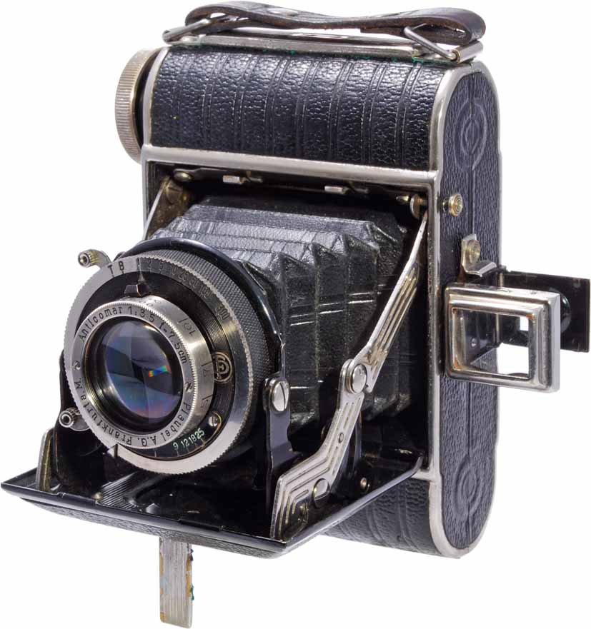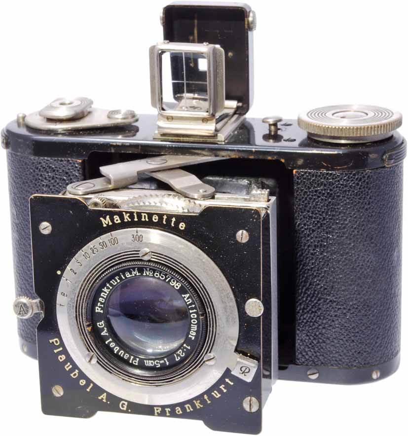 Home 行事 会員へのお願い 2009年第3回目の研究会は5月9日14時からJCIIの6階で開催され、約50名の参加がありました。今回の研究会テーマは「カメラ名または製造会社名がOまたはPで始まるカメラ」でした。国産ではオリンパスやペトリのカメラ、小西六のパール、外国ではプラウベルのカメラが多く見られました。今回の報告では前半にプラウベルのカメラについて解説を行い、後半でその他のカメラについて持参カメラリストと一部のカメラの写真を掲載いたします。 ◆ プラウベルのカメラ -ヒットラーの専属カメラマンも使った- ◆ プラウベル(Plaubel & Co.)はストラット型フォールディングカメラのマキナシリーズで有名な会社だが、会社そのものや他のカメラを含む全般を記述した良い資料が見当らない。筆者の知るところではW.クロス(Dr. W. Cross)著、1937年発行の「Das Buch der Makina」が戦前のマキナについて詳しく述べているが、会社そのものの説明はあまりない。戦後では、プラウベルが日本のドイ・インターナショナルに売却された時に作った「Plaubel」という資料があるが、これもマキナシリーズ以外の戦前のカメラについてはほとんど記述がない。カメラそのものはMcKeownのプライスガイド(McKeown’s Price Guide to Antique & Classic Cameras以下McKeown’sと記す)やW.ケルクマン(W. Kerkmann)のドイツカメラ(Deutche Kameras)に多くの例が見られる。本稿ではこれらやカメラレビュークラシックカメラ専科に書かれた撮影記なども参考に、マキナシリーズと会員の所有しているカメラについてまとめてみた。 プラウベルは1902年11月にフーゴ・シュラーダー(Hugo Schrader)によりドイツのフランクフルトで創立され、当初は他社のカメラやアクセサリーを販売するとともに、レンズメーカーとしてもスタートした。 フーゴ・シュラーダーは1873年生まれで、1895年からブラウンシュヴァイク(Braunschweig)のフォクトレンダーでセールスマンとして5年間働いた後、フランクフルトのドクター・クリューゲナー(Dr. Rudolf Krügener)(ヴュンシェやヒュティッヒなどとともに1909年に合併してイカとなった有力会社)に入社した。ドクター・クリューゲナーに在籍したのは僅か2年だが、ドクター・クリューゲナーの写真器材に対する独自で革新的なものを作り出そうという姿勢を学んだとされている。1906年にクリューゲナー博士の娘と結婚し、両社は親族関係になっている。翌年、後にフーゴの死後社長を引き継ぐゲッツ・シュラーダー(Goetz Schrader)が生まれ、クリューゲナー博士は第一次世界大戦直前の1913年に亡くなっている。 プラウベル最初のカメラは、1910年に発売された9×12cm判乾板カメラのプレツィジオンス・ペコ(Präzisions Peco)である。このカメラは横型だが、ベースボード上のレールにレンズを引き出すフォールディングカメラで、ストラット型にはなっていない。どちらかというとクリューゲナーのカメラに似ている。レンズはF6.8、シャッターはコンパウンドがついていた。このカメラは1913年頃から縦型のモデルに変更されるが、まだシャッターはコンパウンドでフレームファインダーはない。また10×15cm判も発売されている。写真1は、1922年頃に作られた縦型9×12cm判プレツィジオンス・ペコで、蛇腹の2段伸ばしや上下左右へのレンズシフト機能、フレームファインダーと反射ファインダーおよび水準器を備え、レンズはアンチコマー(Anticomar)12.5cm F2.9、シャッターは旧コンパーが付いた高級機である。この機種には乾板カメラには珍しい連動距離計の付いたものも知られている。この1922年型にはこの他6.5×9cmおよび10×15cm判があり、横型のものもあった。 マキナシリーズ最初のカメラは4.5×10.7cm判のステレオマキナ(Stereo Makina 写真2)で、1911年に発売された。なお最近のMcKeown’sなどでは1912年と書かれているが、1937年発行の本には説明も含めて1911年とはっきり書かれているので1911年とした。ピントは目測で合わせるアトム倍判のステレオカメラであるが、マキナの特徴であるX型ストラットを採用している。本機は1923年まで製造されたが、その後継機として1926年に6×13cm判のステレオマキナが発売された。最初のものよりサイズが大きくなり、シャッターも旧タイプのステレオコンパーになっているが、構造は1912年発売のものとほとんど同じである。レンズはアンチコマー90mmF2.9になり、焦点距離が前の60mmより長い。 写真3は、最初のものが1912年に発売されたアトム判(4.5×6cm)のマキナで、ステレオ部以外はステレオマキナと同じ構造である。図1に示すように、2本の幅広ストラットをX型に交差させ、夫々の一端をボディとレンズボード端の軸に回転自在に止め、他端はボディとレンズボードにつけた溝の中を移動できるようにしてある。この構造によりレンズボードの繰り出しや収納が自由にできるとともに、右に出ている繰り出しノブを回すと、ノブ先端とネジ勘合するコの字型金属部材が上下のストラット端を移動させてレンズボードを前後に動かし、焦点調節を行う