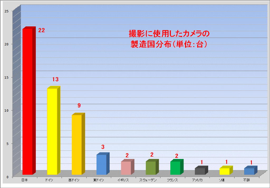 今回の作品の撮影に使われたカメラの発売年別および国別の分布グラフ